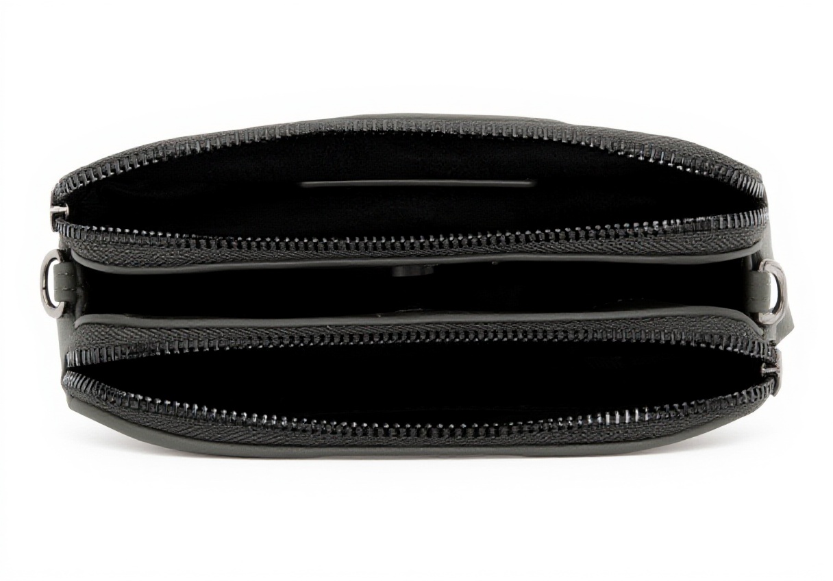 This crossbody bag features a practical double zip closure system for secure access, an adjustable 24-inch strap that accommodates various wearing preferences, and multiple interior organizational pockets including zip compartments and snap dividers for efficient storage management.