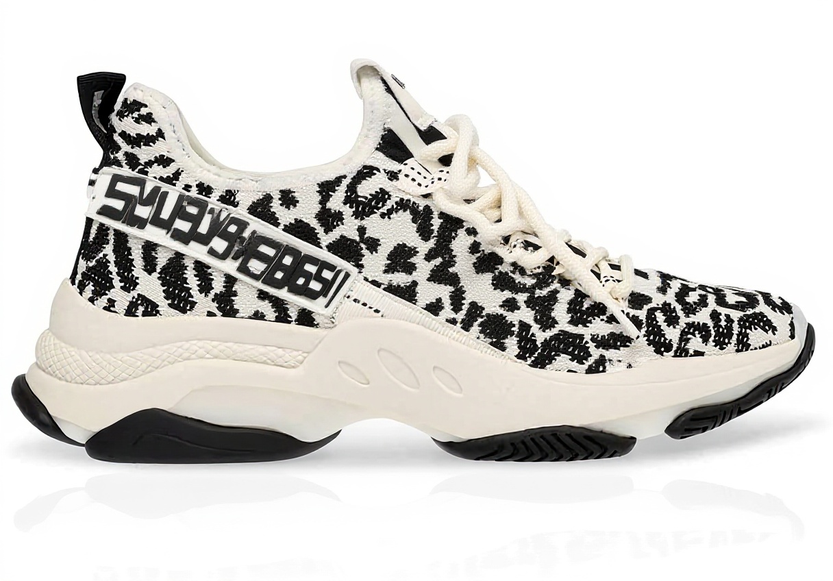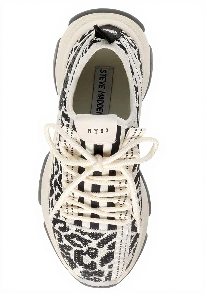The Steve Madden Maxima Sneaker showcases a blend of style and sustainability with a knit upper, vegan suede accents, and stud embellishments. Its embossed strap detail and monochromatic color palette create a sleek, sophisticated silhouette, while the shiny sculpted sole adds a modern touch.