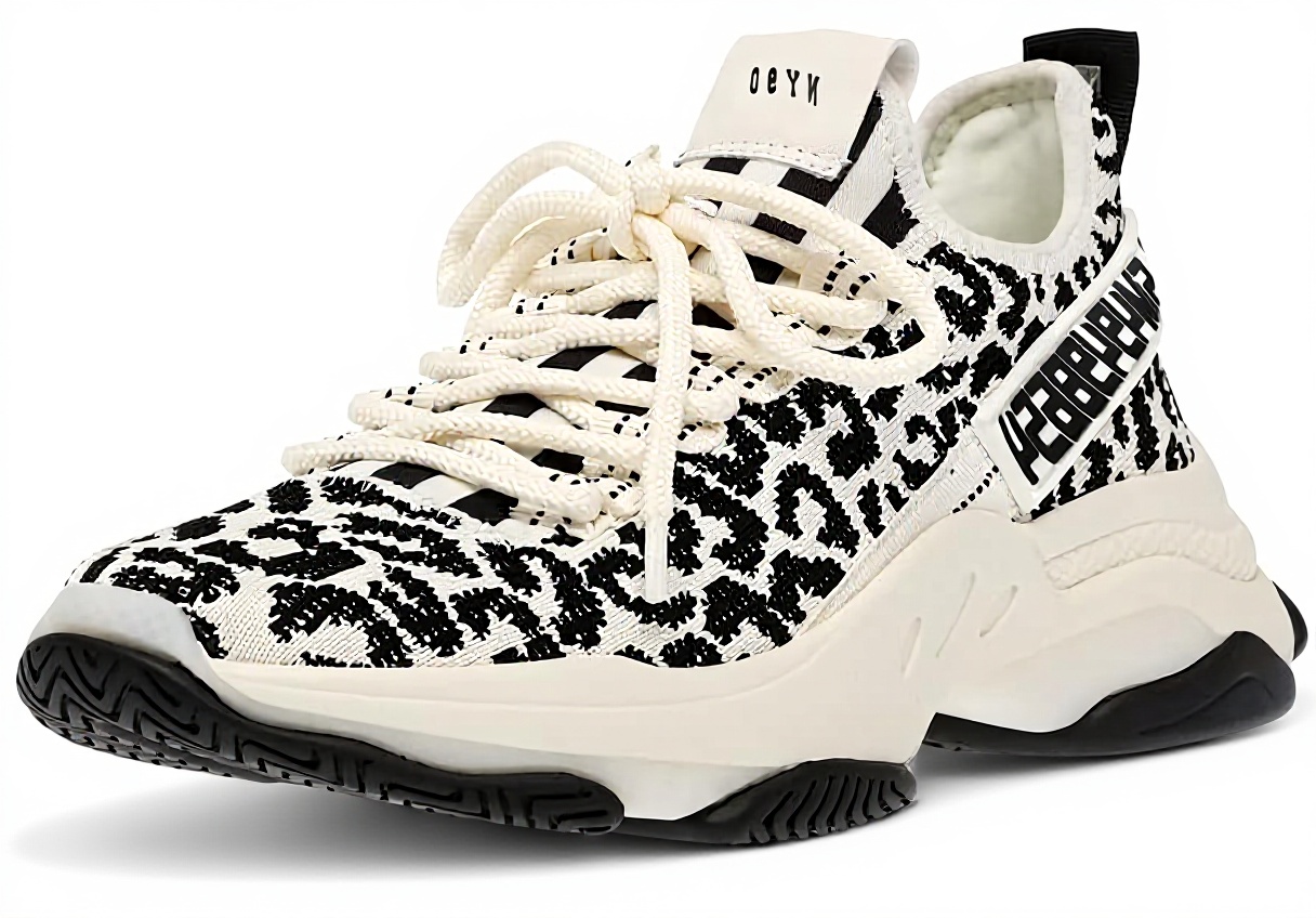 This sneaker fits narrow, so it’s recommended to size up by half to a full size for the best fit. It features a 1.75-inch heel height and is available in leopard print, combining lightweight materials for easy wear. The design emphasizes texture-blocking for a contemporary look.