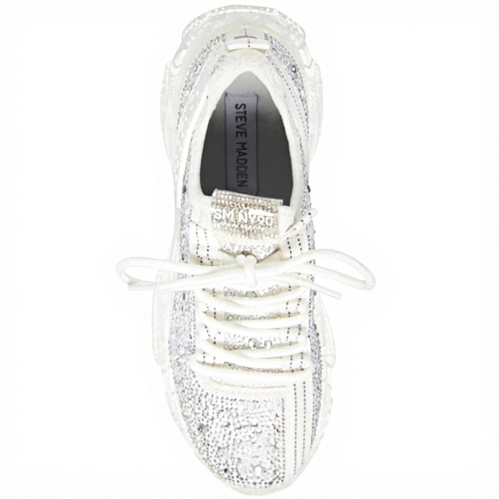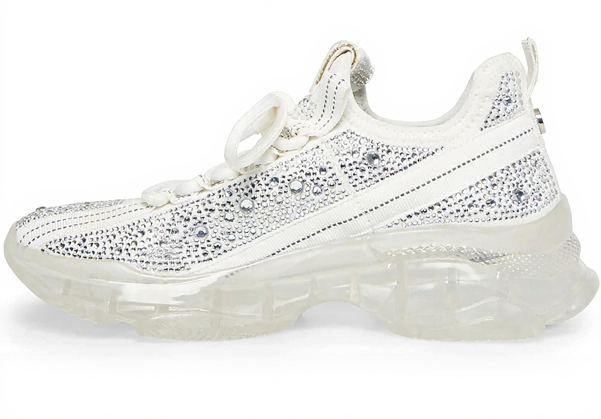 This sneaker features dimensions of 32.51 x 21.84 x 12.19 cm and is available in sizes like 6 US and 11 US in White Multi Rhinestone. It has a narrow fit, with recommendations to size up by half to a full size for optimal comfort, and includes a 1.75-inch heel height on a shiny sculpted sole for added support.