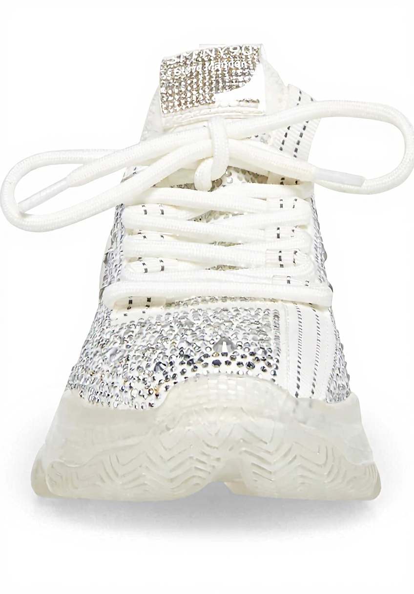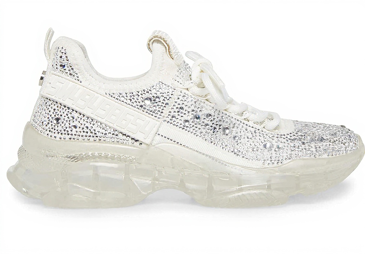 The Steve Madden Maxima sneaker showcases a blend of a knit upper and vegan suede, accented with stud and rhinestone embellishments for a stylish, ethical design. It includes an embossed strap detail and a monochromatic color palette, offering a sleek silhouette with texture-blocked elements that elevate everyday fashion.