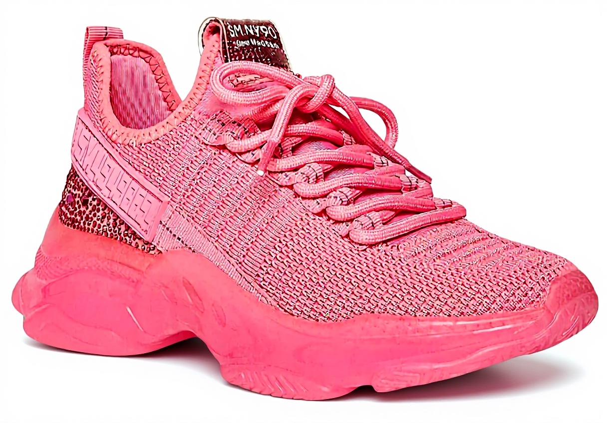 This sneaker runs small, so it is recommended to size up by half to a full size for the best fit. Available in hot pink color options for sizes like 7.5 US and 9.5 US, it is designed specifically for women and includes a model number of MAXIMA. The materials include synthetic components for the sole and a combination of lycra and knit for the upper, providing a lightweight and flexible structure.