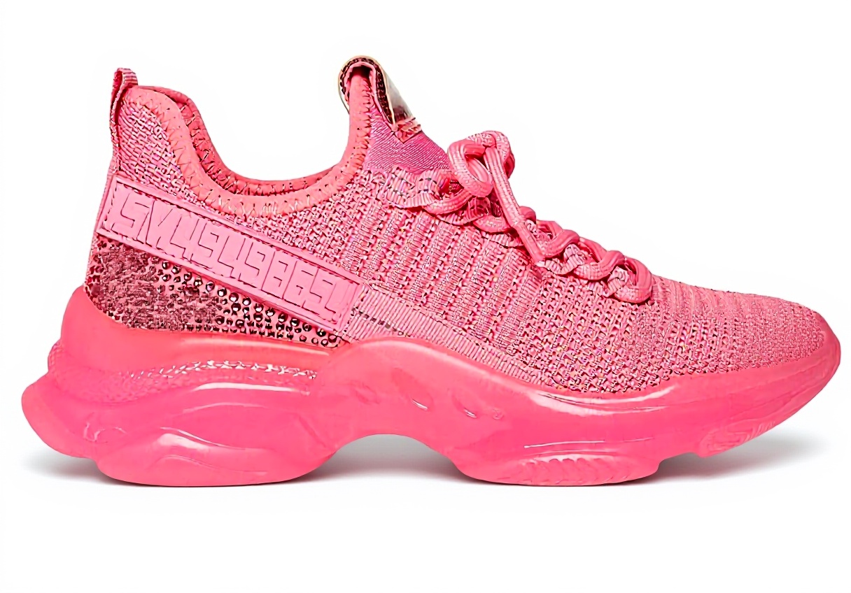 The Steve Madden Maxima sneaker showcases a blend of style and functionality with its easy slide-on lace-up design, making it simple to wear while adding a fashionable touch. It features eye-catching rhinestone embellishments and a rubber logo detail on the side, crafted from comfortable lycra and knit materials for a breathable fit. The synthetic sole ensures durability and support, ideal for daily activities.