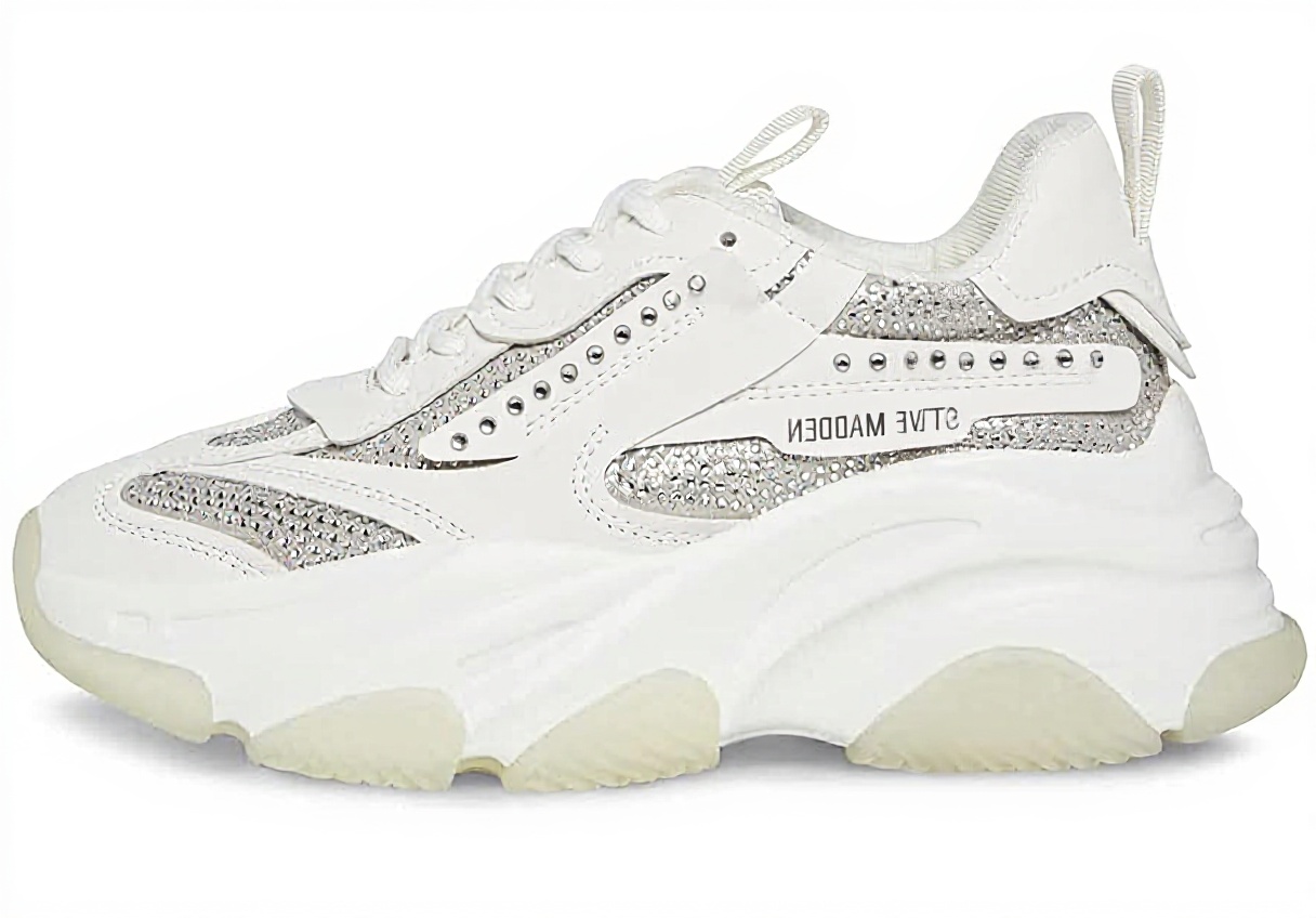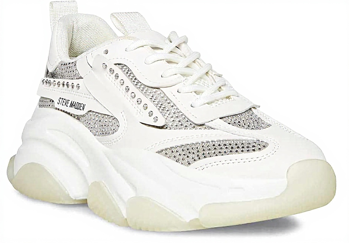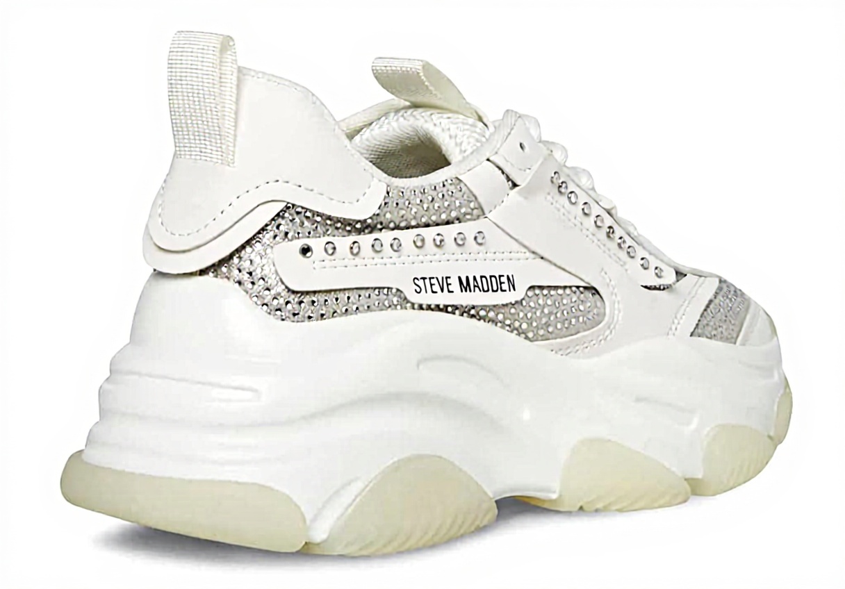 The Steve Madden POSSESSION trainers showcase a contemporary dad sneaker design that combines street-style aesthetics with sophisticated details. These women’s shoes feature elegant white rhinestone accents that add subtle sparkle to the classic sneaker silhouette. With a substantial 2.5-inch heel height, they provide both elevation and comfort, making them ideal for all-day wear while maintaining a fashionable profile.