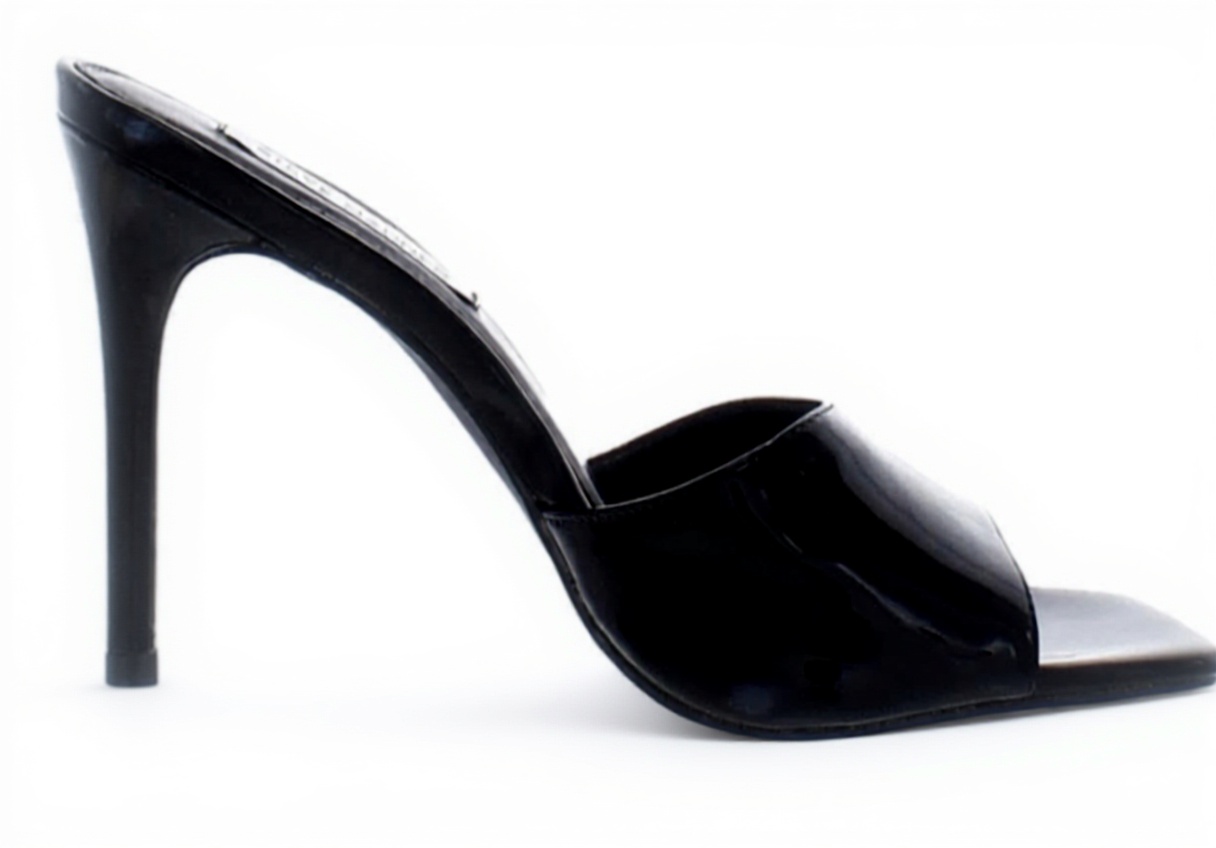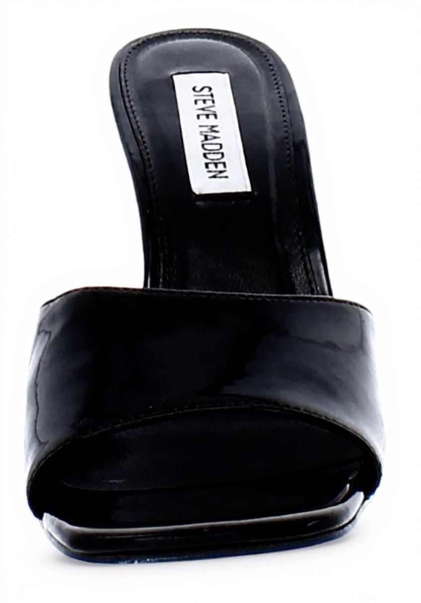 This Steve Madden slide sandal features a striking stiletto heel and a clear foot strap that enhances visibility and style. Made from high-quality black patent leather, it offers a glossy finish and durable construction, while the square open toe design adds a contemporary touch for everyday wear.