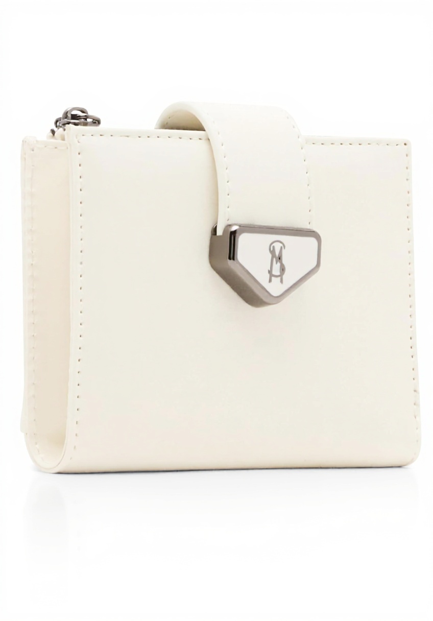 This bifold wallet from Steve Madden is designed for efficiency and style, featuring a compact build that easily fits into purses or pockets. Crafted from high-quality polyurethane, it offers durability and a sleek appearance, with a snap closure for secure access to your belongings.