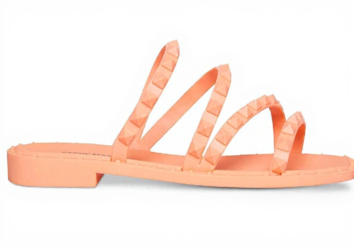 The Steve Madden Skyler flat sandal features criss-cross straps with stud details, creating a chic and modern look. Crafted with a thermoplastic rubber sole, it ensures durability and traction. This slide sandal design offers easy slip-on wear, making it a convenient choice for everyday use.