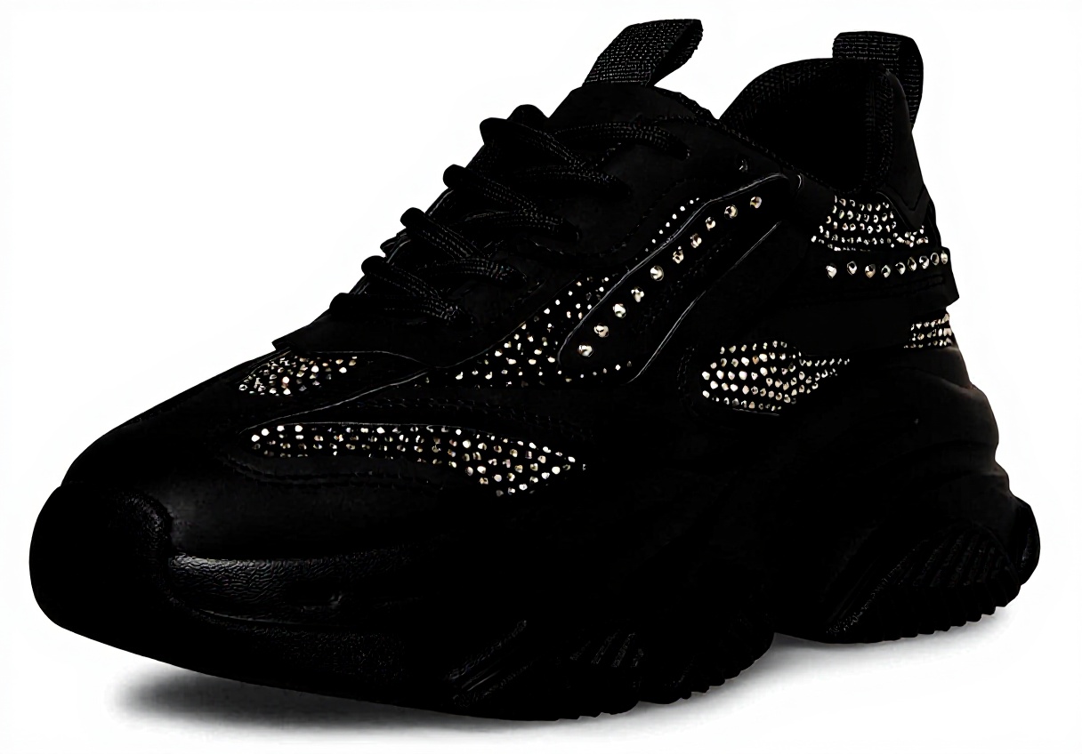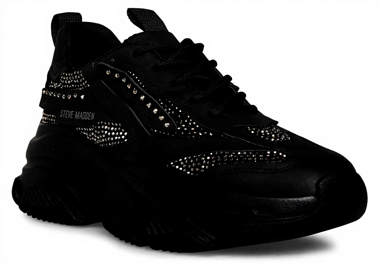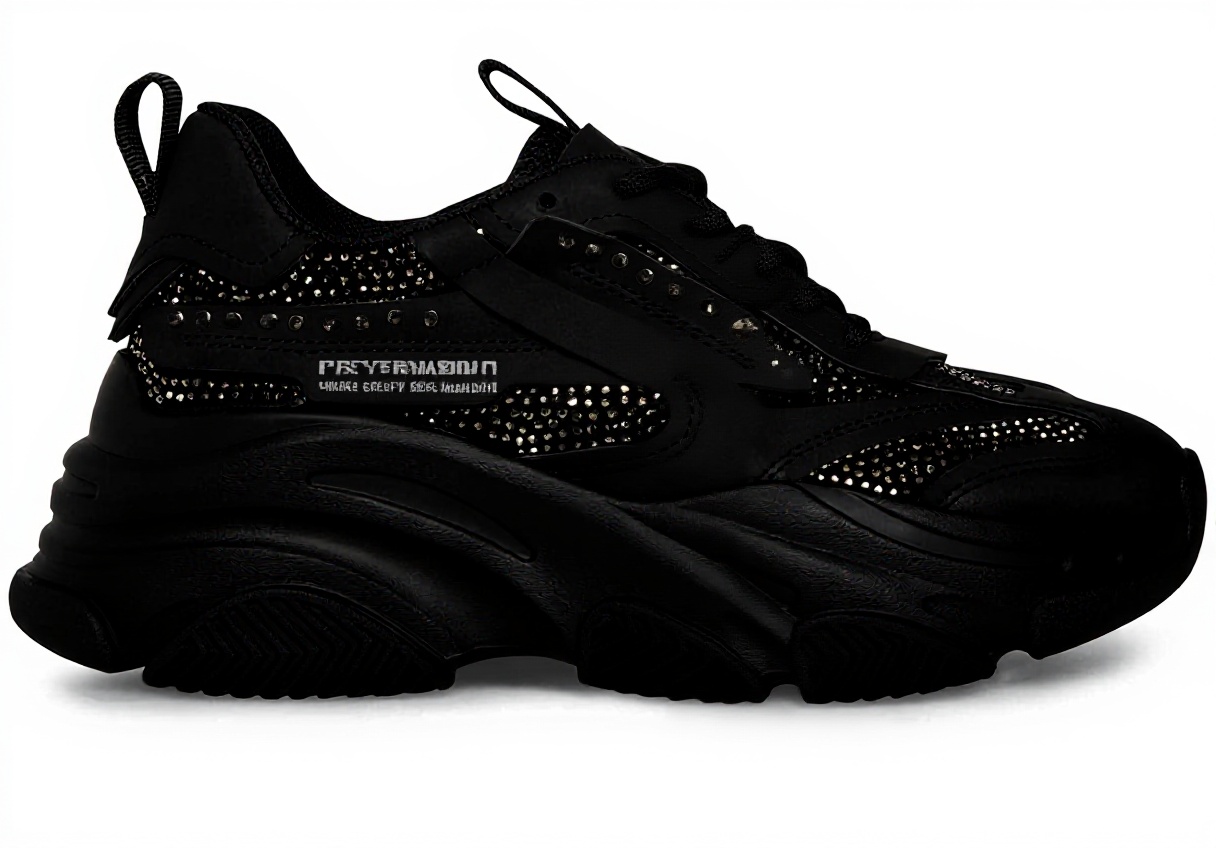 Available in sizes 5 US to 9.5 US, these trainers fit narrow, so sizing up half to a full size is recommended for the best comfort. The model number is POSS04S1, and they are designed specifically for women, with a Black Rhinestone color option that adds a touch of elegance to the classic sneaker silhouette.