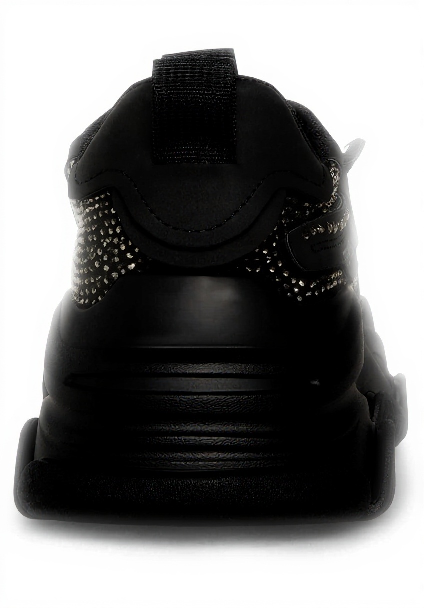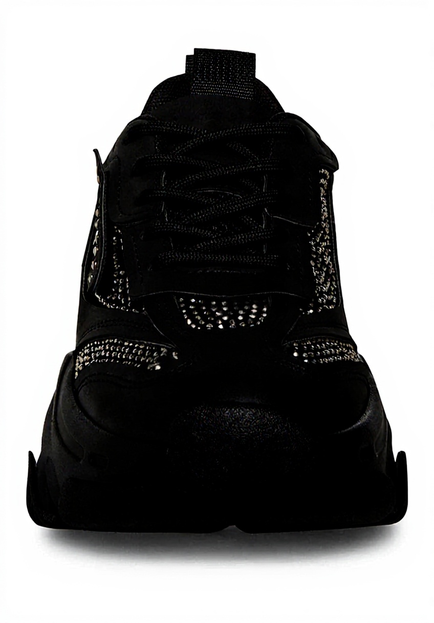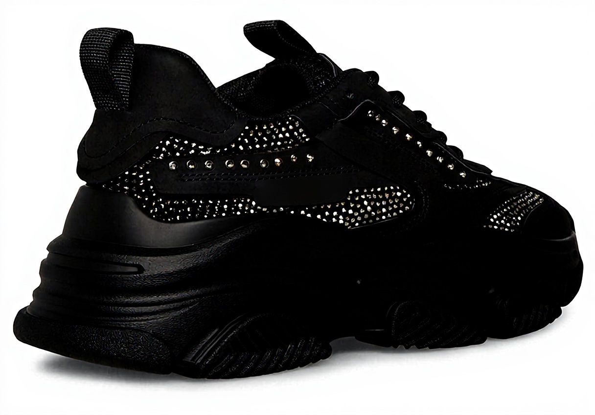 Available in sizes 5 US to 9.5 US, these trainers fit narrow, so sizing up half to a full size is recommended for the best comfort. The model number is POSS04S1, and they are designed specifically for women, with a Black Rhinestone color option that adds a touch of elegance to the classic sneaker silhouette.